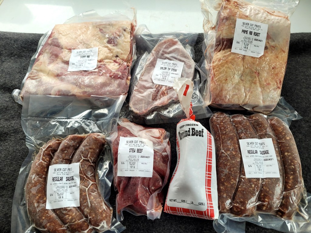 We are selling our beef by the half or quarter for $8 per pound hanging weight approx (150 (1/4) to 300 (1/2) pounds of beef). Price includes butchering costs and wrapping (paper or vacuum).